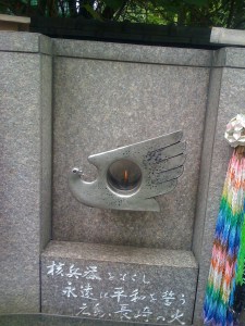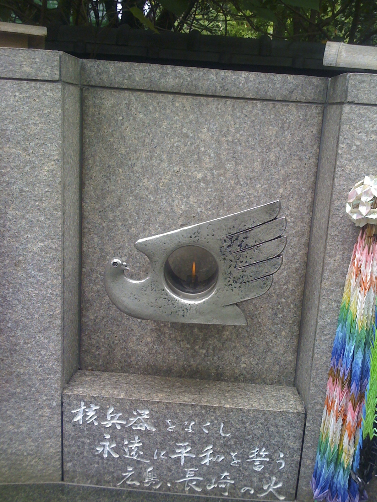 En 1945, un habitant d’Hiroshima a retrouvé la maison de son oncle ravagé par l’incendie du bombardement. Il a ramené à pied une flamme à Tokyo. Plus tard, les flammes d’Hiroshima et de Nagasaki furent réunies en une seule qui, depuis 1945, n’a jamais cessé de brûler, entretenue religieusement par les moines du parc de Ueno.