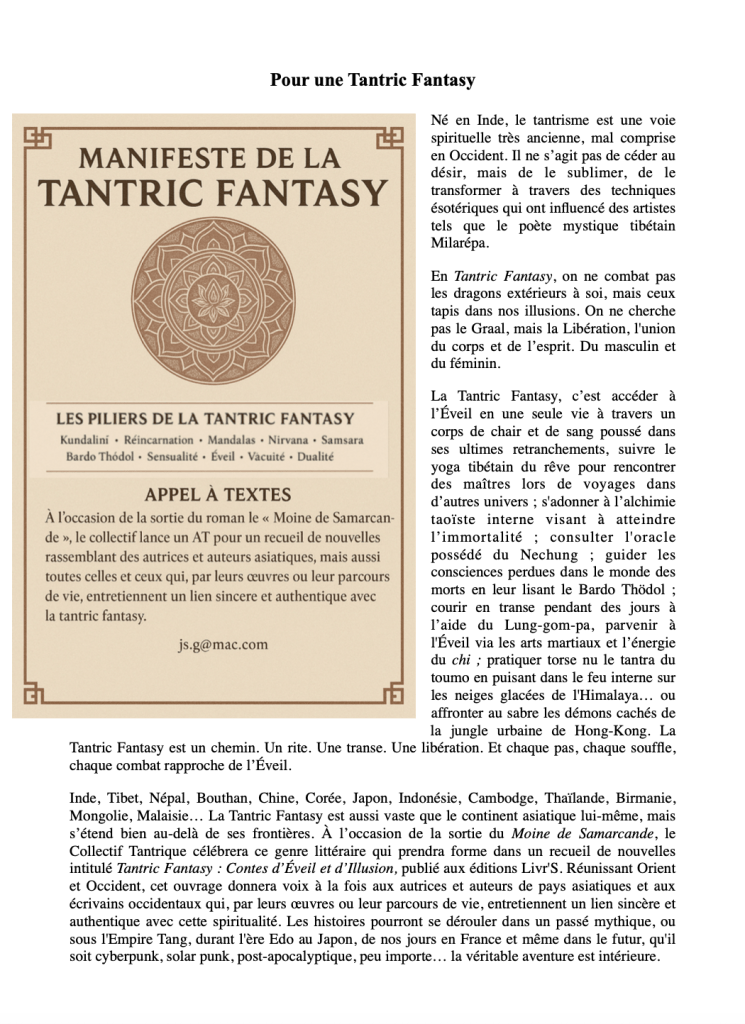Inde, Tibet, Népal, Bouthan, Chine, Corée, Japon, Indonésie, Cambodge, Thaïlande, Birmanie, Mongolie, Malaisie… La Tantric Fantasy est aussi vaste que le continent asiatique lui-même, mais s’étend bien au-delà de ses frontières. À l’occasion de la sortie du Moine de Samarcande, ce genre littéraire prendra forme dans un recueil de nouvelles intitulé Tantric Fantasy : Contes d’Éveil et d’Illusion, publié aux éditions Livr’S. Réunissant Orient et Occident, cet ouvrage donnera voix à la fois aux autrices et auteurs de pays asiatiques et aux écrivains occidentaux qui, par leurs œuvres ou leur parcours de vie, entretiennent un lien sincère et authentique avec cette spiritualité. Les histoires pourront se dérouler dans un passé mythique, ou sous l’Empire Tang, durant l’ère Edo au Japon, de nos jours en France et même dans le futur, qu’il soit cyberpunk, solar punk, post-apocalyptique, peu importe… la véritable aventure est intérieure.